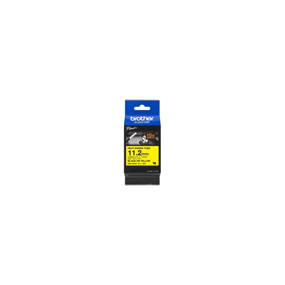 HSE-631E - NOVÁ, ŽLUTÁ originální bužírka, smrštitelnost 3:1, šířka 11,2 mm, černý tisk na žluté, délka 1,5 m z řady PRO Tape (design černo-modrého balení): Nutné si stáhnout a aktualizovat firmware u vaší tiskárny(platí pouze pro tiskárny připojitelné k PC). Vhodná pro značení vodičů, síťových, optických a jiných kabelů o průměrů 2,1 - 7,0 mm. Páska se smrští v poměru 3:1; 50% nebo více v průměru; Doporučená teplota 110 - 140 stupňů Celsia. Páska je ve shodě s normou UL224 pro provozní napětí, teplotu a hořlavost. Hodnocení hořlavosti VW1. Smršťovací bužírky Brother izolují do 300V. Lze použít ve vybraných Brother tiskárnách umožňujících potisknout HSE bužírky(PT-E300VP, PT-E550W, PT-P750W, PT-P900W, PT-P950NW, PT-D800W). |