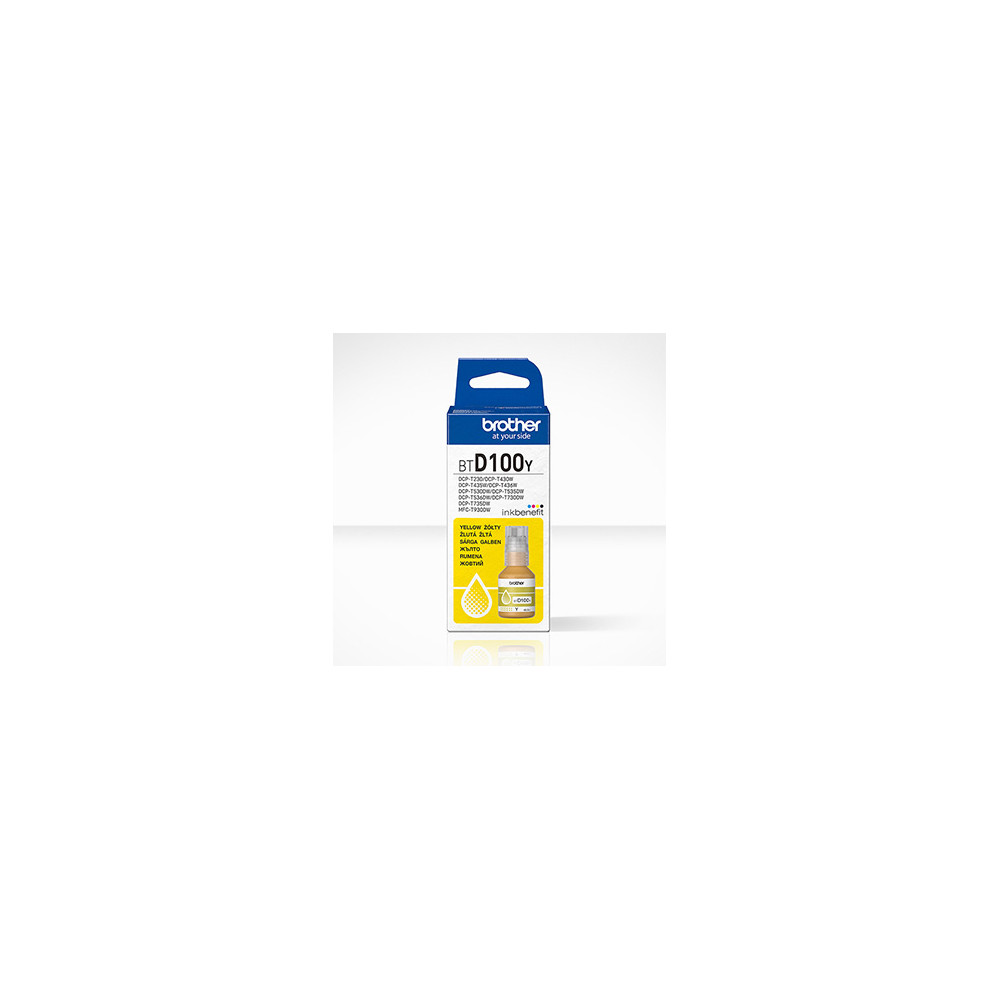 Originální žlutý inkoust Brother BTD100Y zajistí zářivé barvy a ostrý tisk barevných dokumentů. Výtěžnost činí až 5?000 stran, ideální pro domácnosti i kanceláře s vyšší spotřebou barev. Je určen pro inkoustové tankové tiskárny Brother řady DCP-T a MFC-T.